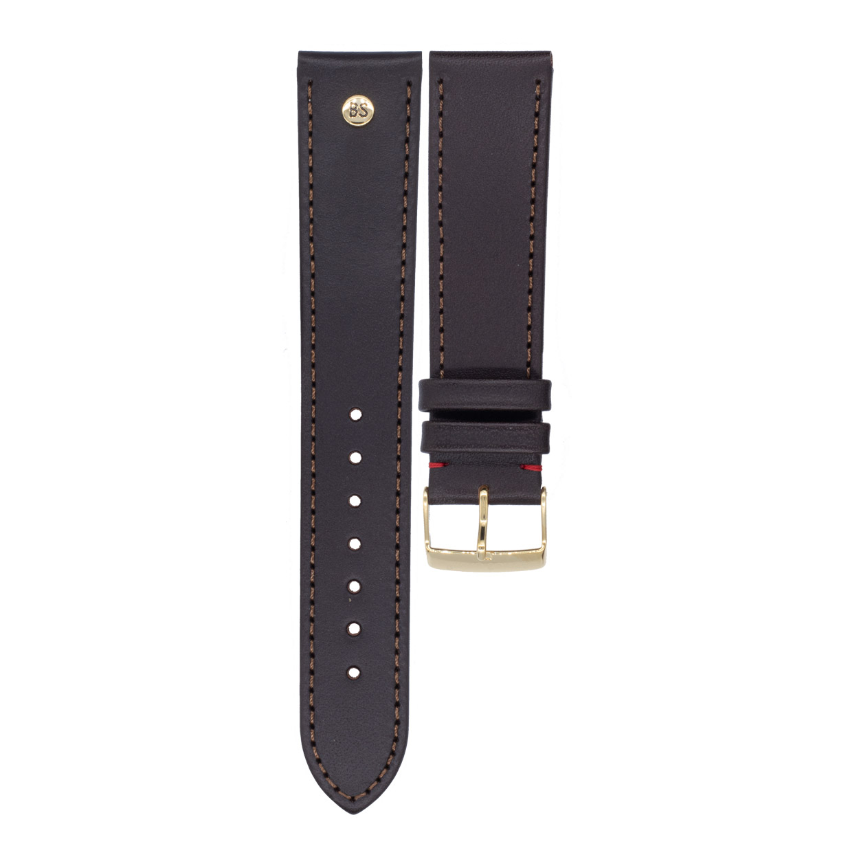 Das Ersatzband ist in dunkelbraunem Leder mit feiner brauner Kontrastnaht und goldfarbener Dornschließe gearbeitet. Das Uhrenband hat eine Ansatzbreite von 20mm und steht für hochqualitative Verarbeitung, alltägliche Belastbarkeit und hervorragenden Tragekomfort.